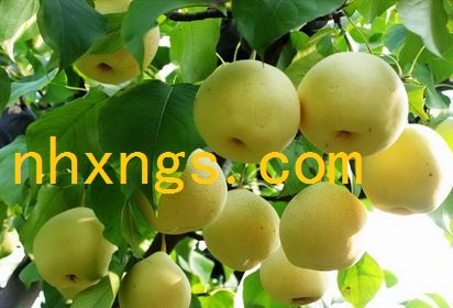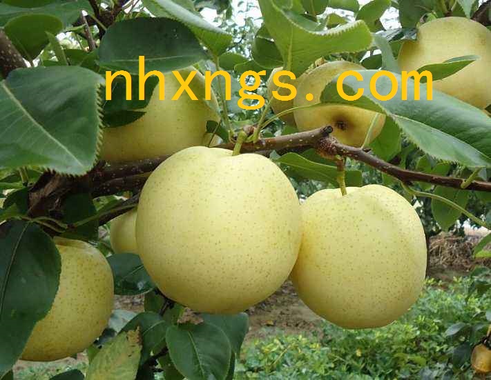 黄金梨果实近圆形或稍扁,平均单果重250克,大果重500克。不套袋果皮黄绿色,贮藏后变为金黄色。套袋果皮淡黄色,果面洁净,果点小而稀。果肉白色,肉质脆嫩,多汁,石细胞少,果心极小,可食率达95%以上,不套袋果可溶性固形物含量14%~16%,套袋果12%~15%,风味甜。果实9月中下旬成熟,较耐贮藏。